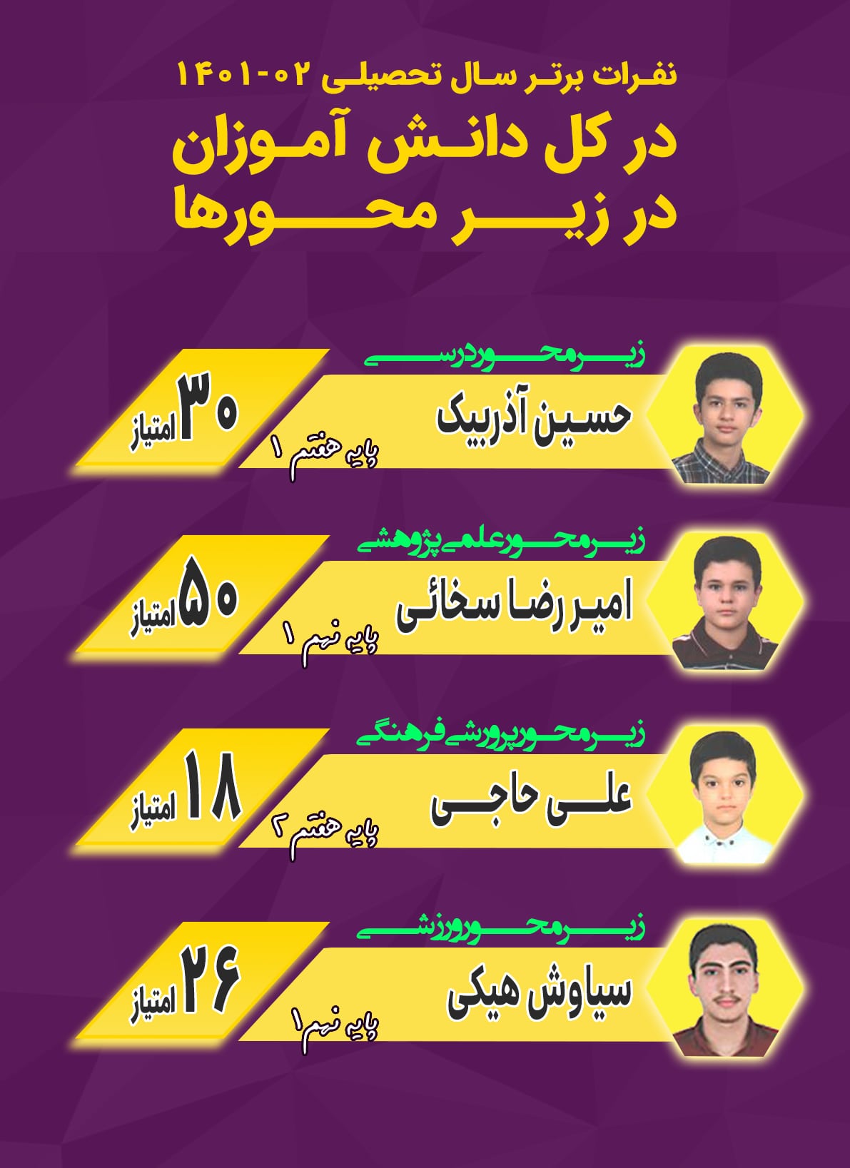 نفرات برتر در بین کل دانش آموزان دبیرستان با توجه مجموع امتیازات کسب شده در هر زیر محور (شامل زیرمحورهای درسی ، علمی - پژوهشی ، پرورشی - فرهنگی و ورزشی). لازم به ذکر است که محور ادبی - هنری ، تا پایان سال تحصیلی 1401 از امتیاز مناسبی برخوردار نبوده و لذا در جدول نفرات ، فردی برای این زیر محور معرفی نشده است . بدین ترتیب ، نفرات برتر برای هر زیر محور بدین صورت هستند: