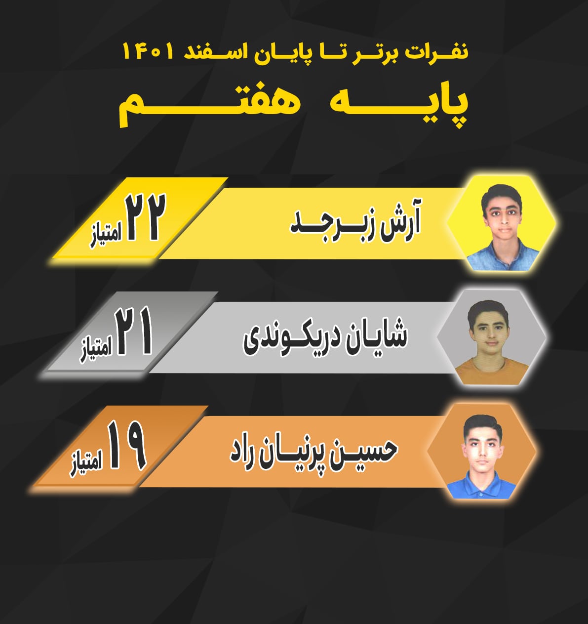 نفرات برتر پایه هفتم بر اساس مجموع امتیازات کسب شده در زیر محورهای درسی ، علمی - پژوهشی ، ادبی - هنری ، پرورشی - فرهنگی و ورزشی. لازم به ذکر است ممکن است دانشی آموزی در یک زمینه یا بیشتر امتیازی کسب نکرده باشد ولی مجموع امتیازهای کسب شده در هر محور از ابتدای سال تحصیلی تا پایان اسفندماه 1401 مدنظر بوده و لحاظ شده است . بدین ترتیب ، نفرات برتر برای پایه هفتم بدین صورت هستند: